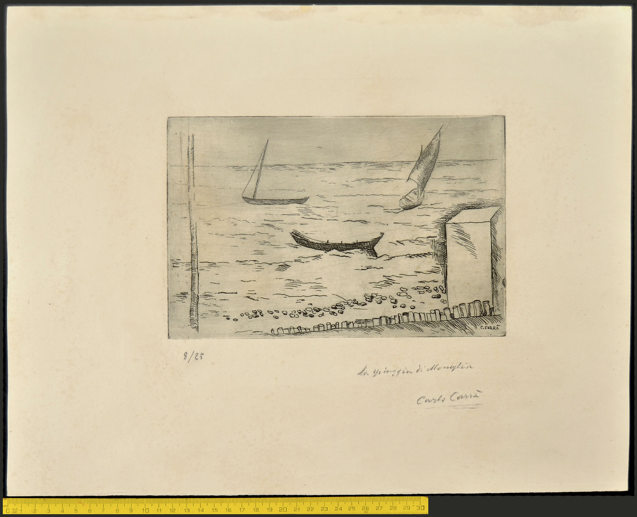 Etching, a fine impression, from the edition of 25 plus two or three proofs, printed in 1924. Signed in the plate C.CARRA’, numbered, titled and signed in pencil on the bottom margin 8/25 / La spiaggia di Moneglia / Carlo Carrà. To the platemark 161 x 245 mm, the full sheet 356 x 455.